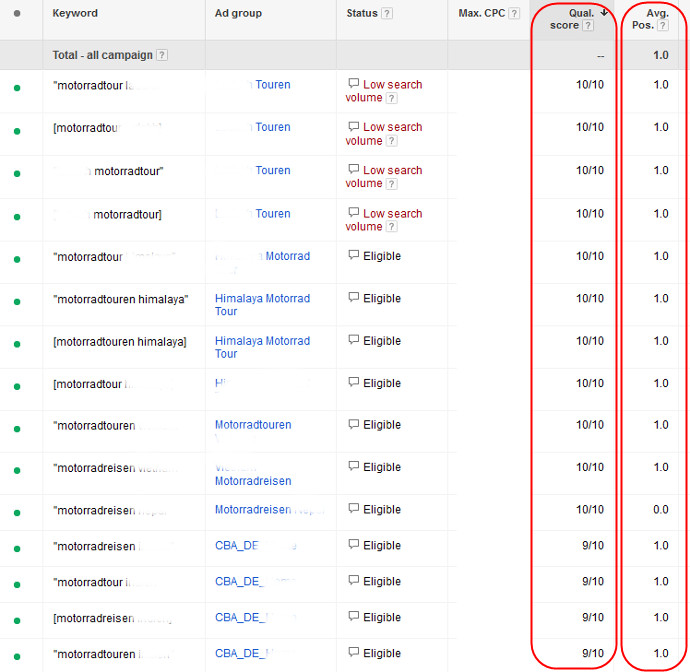 Um dos meus clientes estava a perder dinheiro no Adwords e a obter muito poucas conversões. Quando me pediu para otimizar a sua conta do Google Adwords para o seu website de tours em inglês, aproveitei a oportunidade e produzi excelentes resultados, com a grande maioria das palavras-chave a obter pontuações de qualidade extremamente elevadas, incluindo uma percentagem muito grande de pontuações perfeitas de 10.