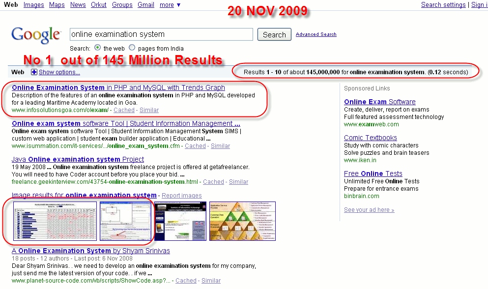 Gostaria ainda de mencionar que desenvolvi um sistema de exames online económico (em inglês) em 2009 e que fiquei bem posicionado para muitos termos relacionados com exames online — durante cerca de um ano fui nº1 entre 145 milhões de resultados para "online examination system". Clique aqui para a captura de ecrã