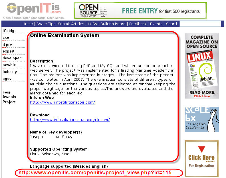 Pouco depois, na segunda metade de 2005, recebi uma encomenda de uma Academia Marítima de referência para desenvolver um sistema de exames online em PHP e MySQL em inglês. O projeto foi realizado em fases e concluído no início de 2007. Este projeto foi nomeado para o prémio de Melhor Software Open Source da Índia em 2007 e entrou na lista final dos 44 melhores. Também foi mencionado pela PC Quest, a principal revista de informática da Índia. As capturas de ecrã estão abaixo. Clique para ampliar.