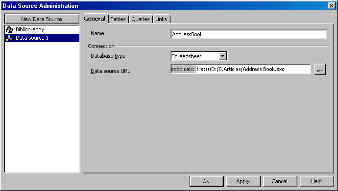 Give a suitable name for the data source say AddressBook. Under Database Type select Spreadsheet . Note that we can use many different types of databases in open office like MySql, dBase and any ODBC or JDBC compliant database. Under Data Source URL , browse to Address Book.sxc ( If you have named your address book that you just created as AddressBook ).
