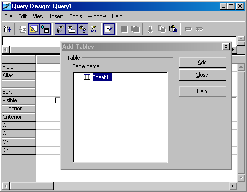 Next click on the Table and then click on OK. After this click on Query and select New Query (Design View), namely the first icon. The query design window will now be displayed along with the Add Tables dialog box. In the Add Tables dialog box click on add.