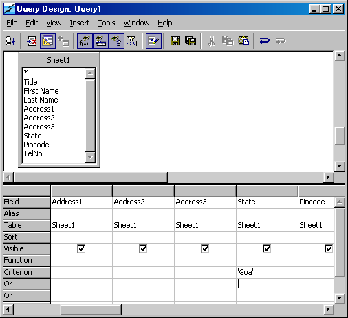 You can now drag and drop the individual fields from the table Sheet 1 in the field row at the bottom or you can keep selecting as many fields as you want in the various columns in the field row. We can also place restrictions on the data that will be generated on running the query. For example if we wish to have the address of people staying in Goa only to be merged with the letter then under the field State at the bottom, corresponding to the criterion enter Goa. The completed query is shown in the screenshot below .