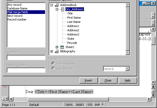 Now position the cursor in the document where you want to insert the field select the field and click on Insert. Repeat the process for all the fields that you wish to insert. After all the fields are inserted click Close. You will now be presented with the mail merge window.