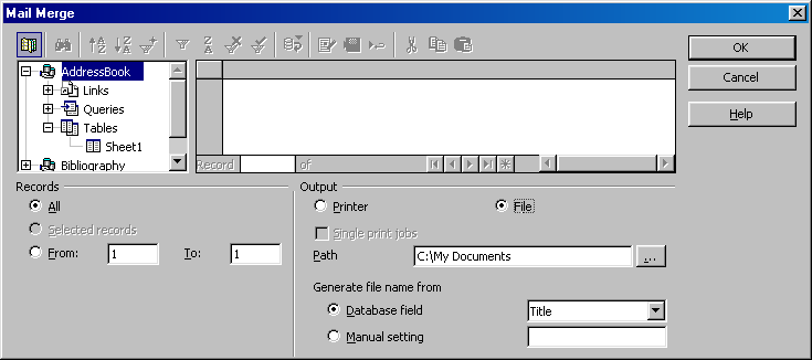 Here select Records as All, Output as File and Generate file name as Manual Setting . Give a suitable name and click OK. The addresses will be merged with your letter and sent to the printer or file as specified by you.